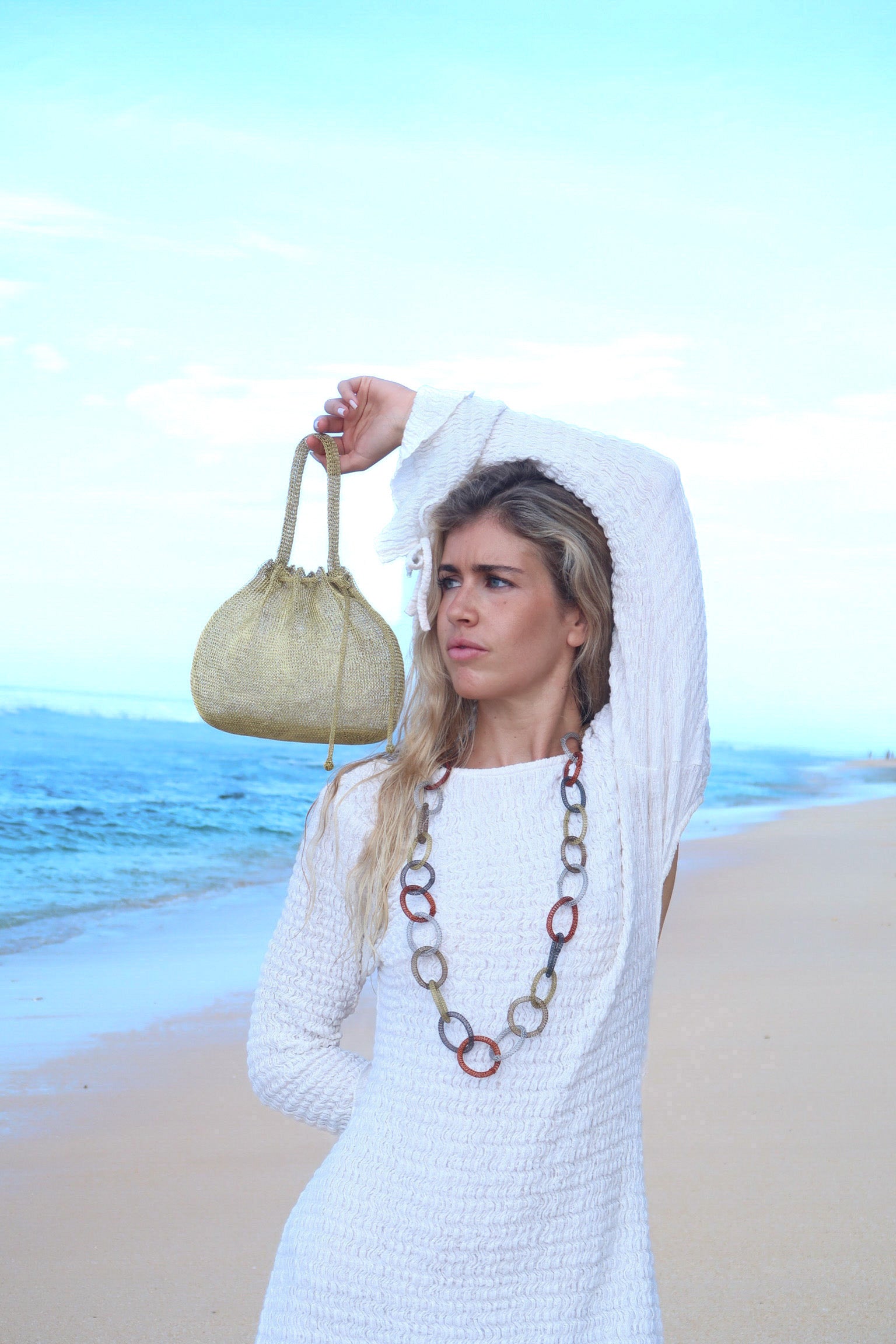 Handcrafted metal mesh bag with a drawstring closure and single handle.