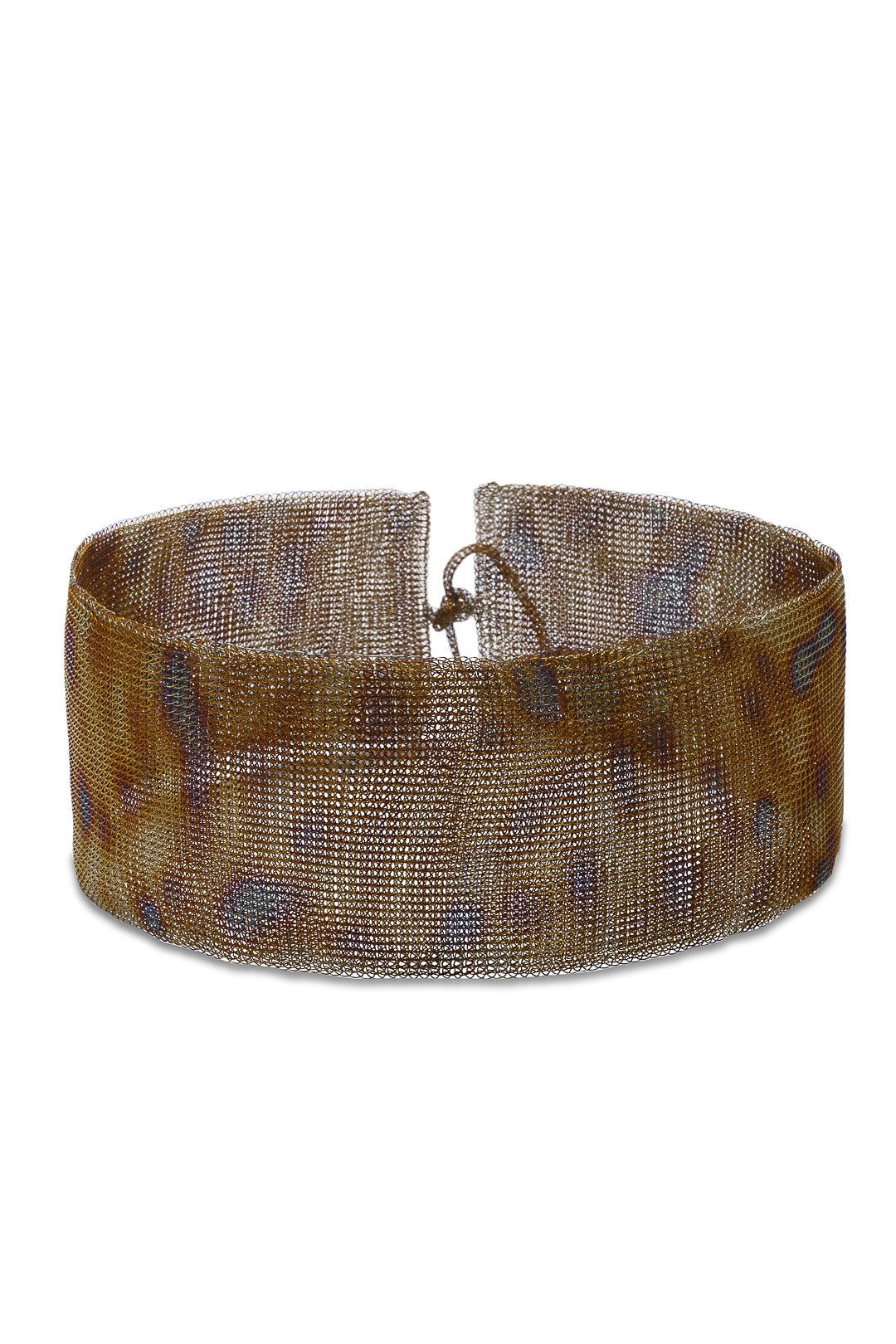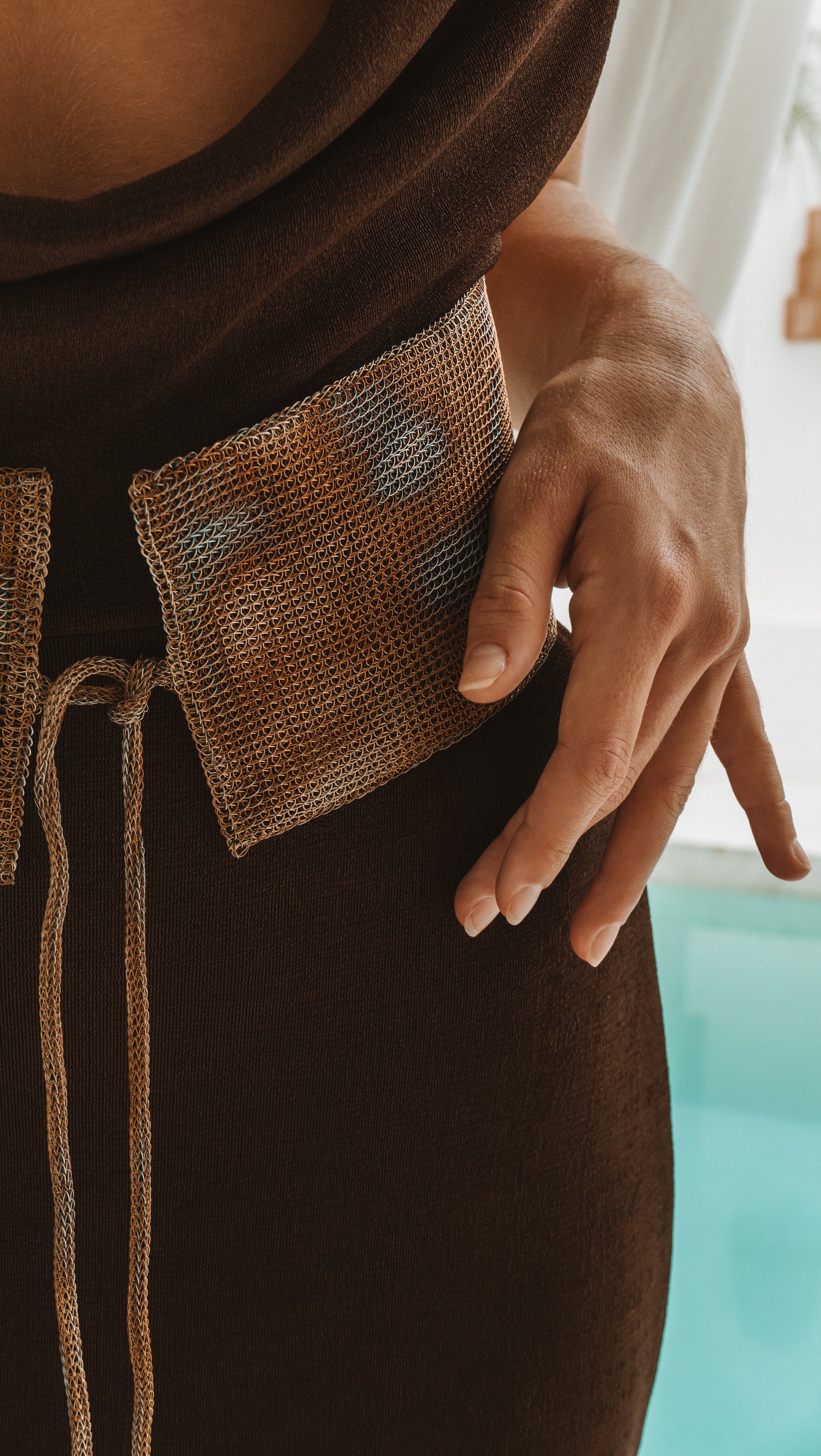 Handcrafted metal mesh belt with a wide silhouette and adjustable tie closure.