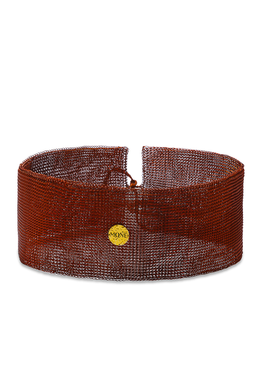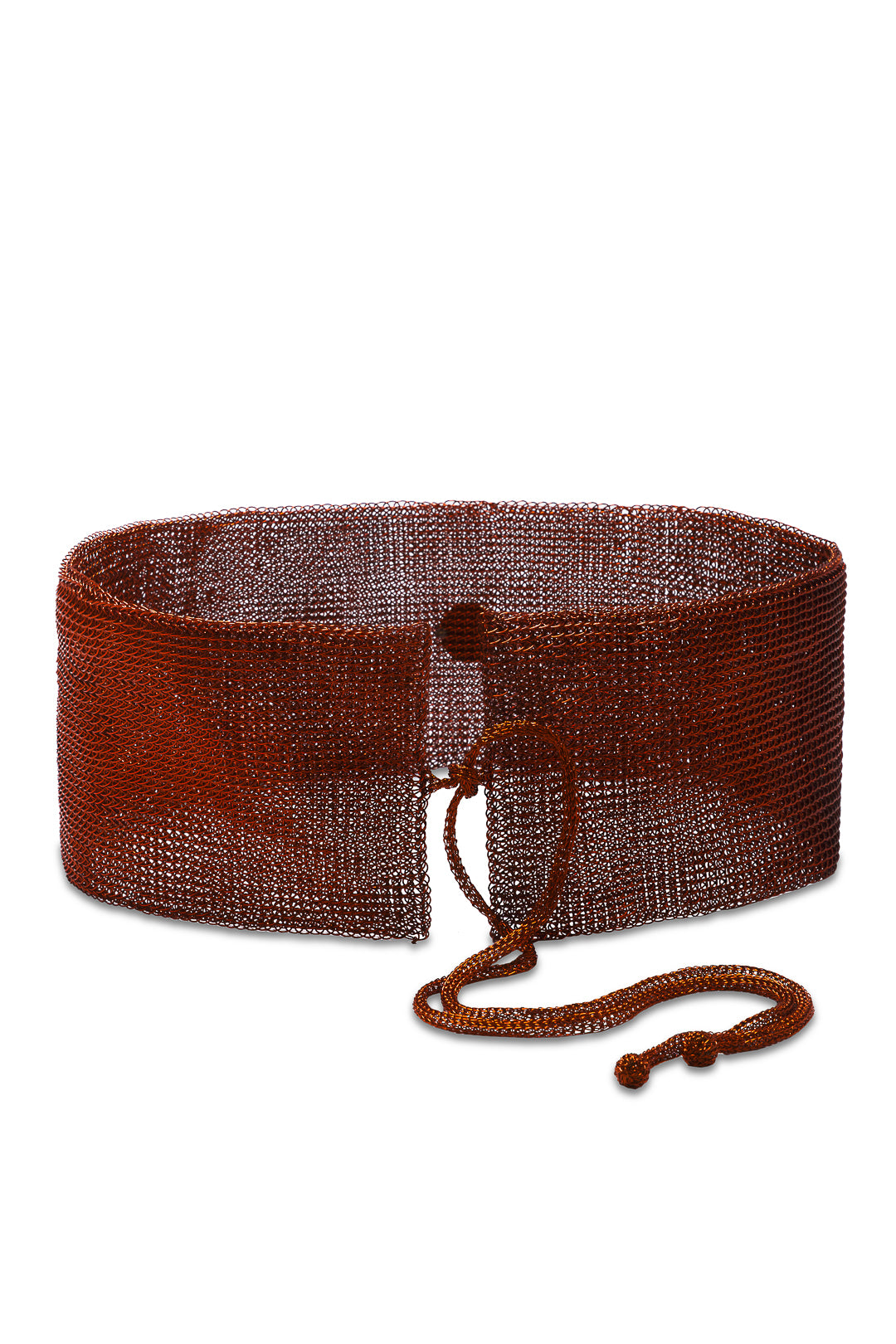 Handcrafted metal mesh belt with a wide silhouette and adjustable tie closure.