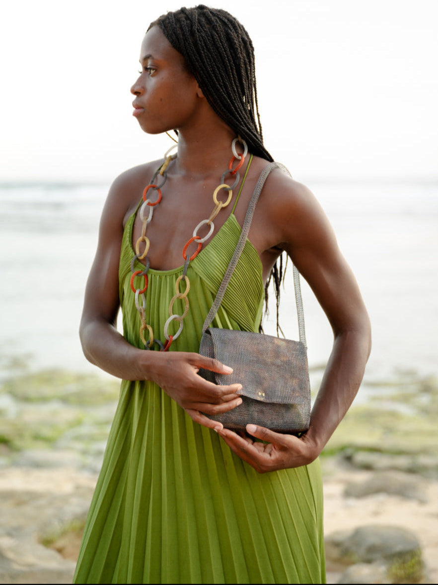 Handcrafted rectangular shoulder bag made from fluid metal mesh. The medium-lenght handle sits confortable on the shoulder, a balance of convenience and elegance.